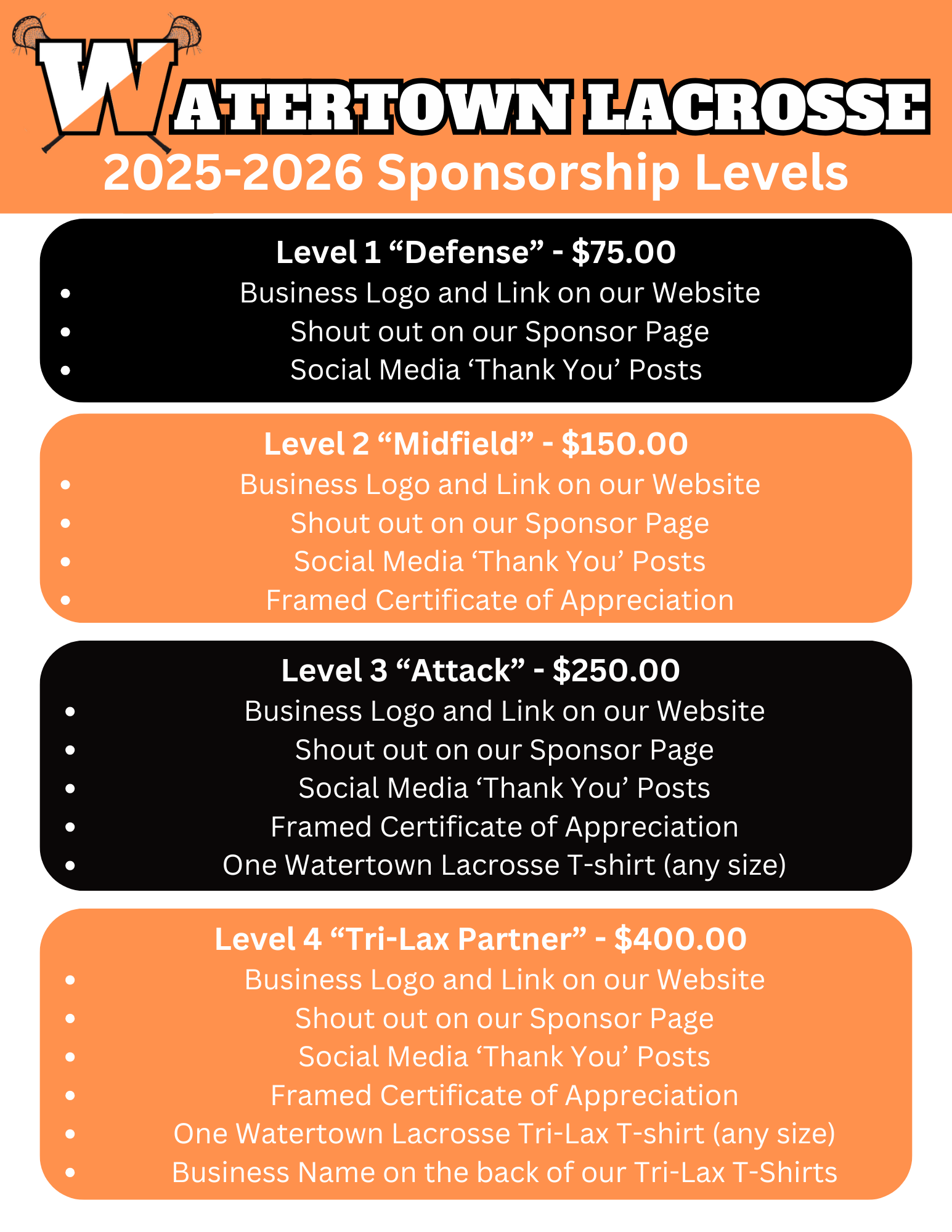 If you would like to receive more information on a sponsor partnership with Watertown Lacrosse Association, please feel free to contact us using the link below! We wish to thank you for taking the time to review this opportunity and for your continued support of the local youth sports community!
